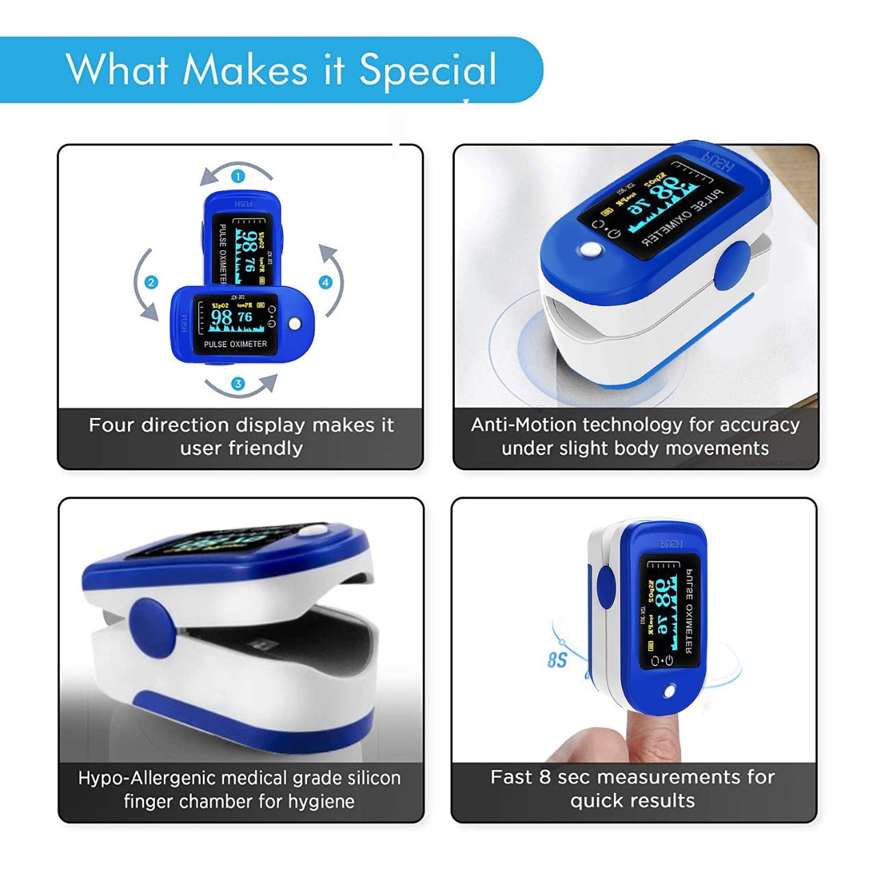 - Accurate: rotatable multidirectional display, allows you to view your results in any direction plus pulse wave, pulse rate, bar graph, spo2 level and battery level