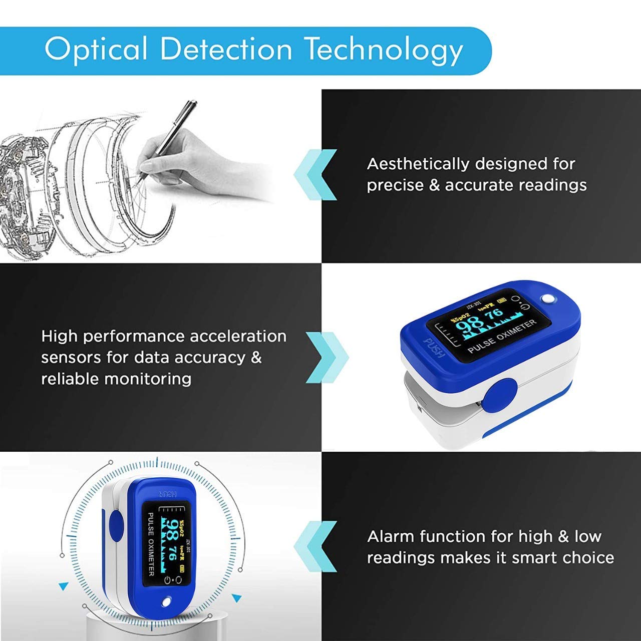 Pulse Rate Range: 30bpm-250bpm and Accuracy: ±2bpm