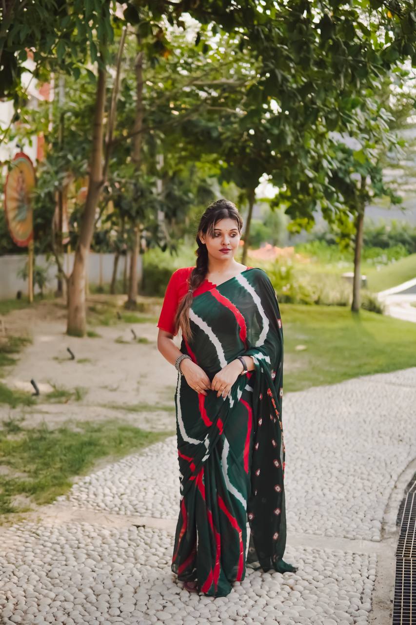 - This saree is a statement piece, blending ancient tie-dye artistry with a modern, dynamic pattern—it’s designed to make you stand out beautifully at any occasion.